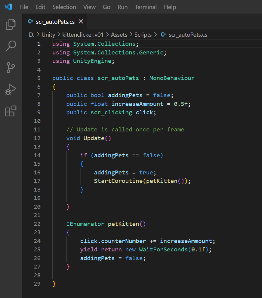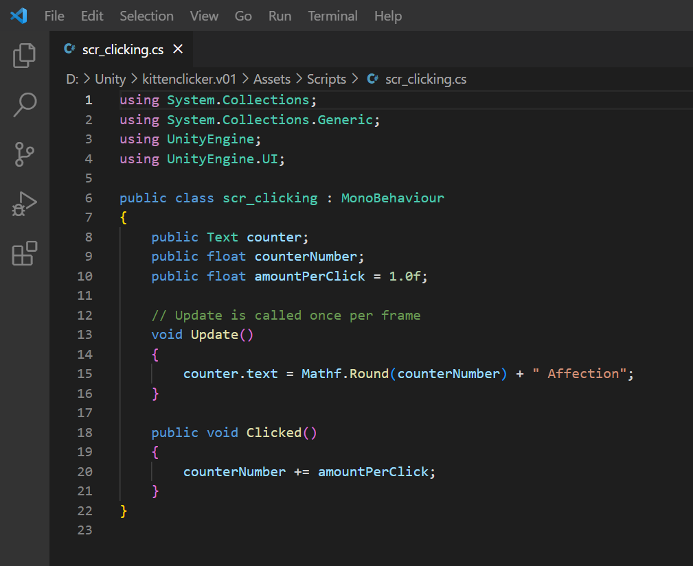 This script was very simple but very essential to the game, it references an in-game counter that will increase by the amountPerClick variable every time an asset is clicked. For this game the asset is the cat button.