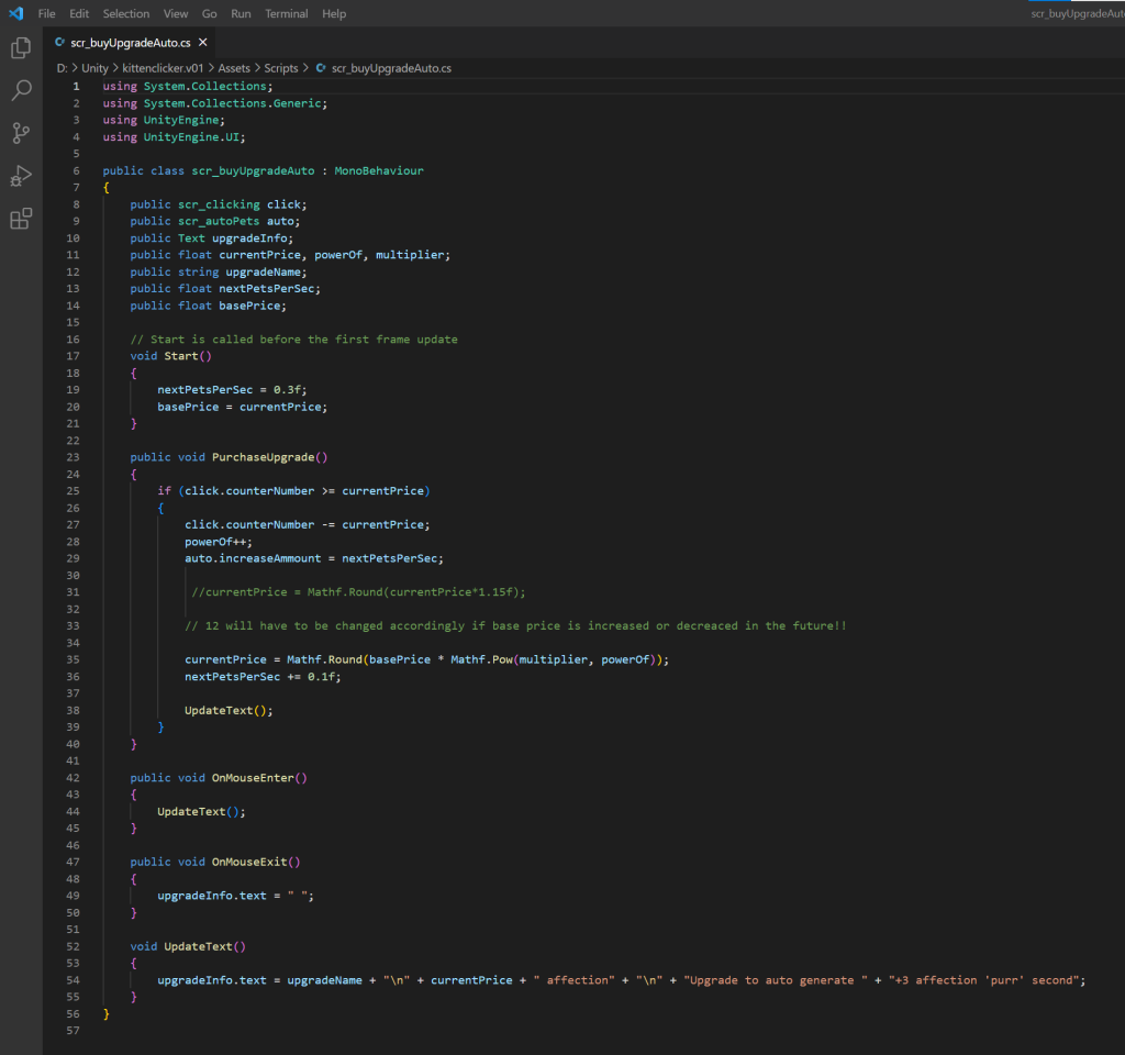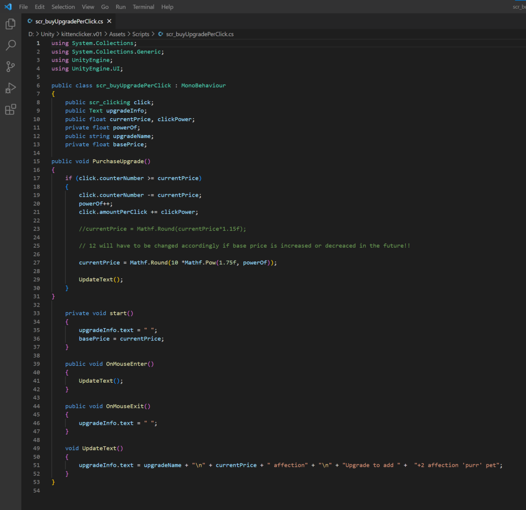 This script does two main things, the first being that once the assigned button is clicked by the player (given that they have the required amount of affection) it will increase the amount of affection given to the player the next time the cat button is clicked and will increase the price of the next per click upgrade.