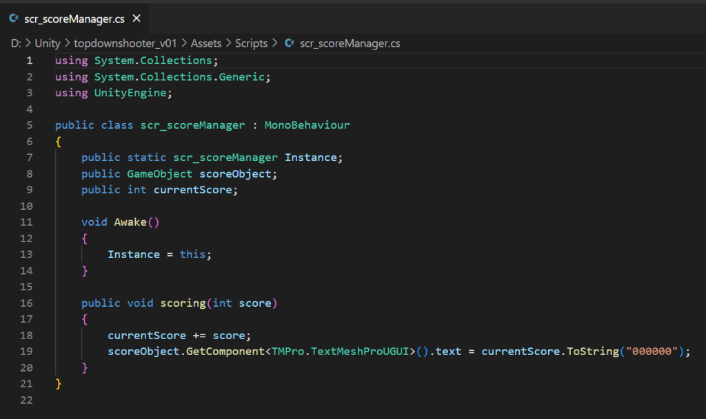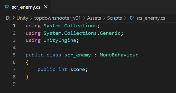 This script is very small, but it is what allows the enemies in the game to have assigned score. This means that this script will be referenced in upcoming scripts to give the player points every time an enemy is killed. The amount of points received by the player is different for each enemy prefab destroyed.