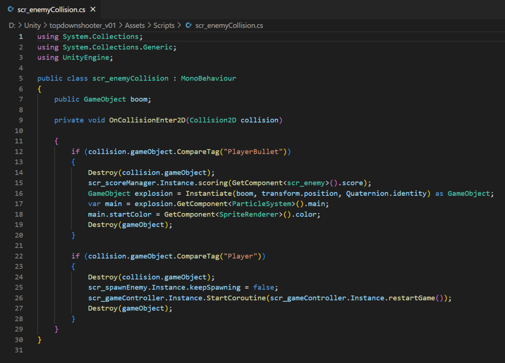 What this script does is that it simulates all of the collisions of the enemy prefabs. This would be the collisions between the enemy and the player and bullets which also tells how the game objects should react when they collide.