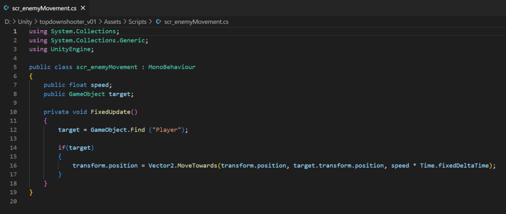 This script allows the enemy sprites to move towards the player once they have spawned since without this script the enemies would just stay at the location where they have been spawned and then I wouldn’t have a game. It does this by finding the player character game object and then uses the Move Towards function to move the enemy to it’s target which has been set as the player when it is enabled. The velocity is changeable in the inspector menu for each respective enemy prefab to have some variety in the game.