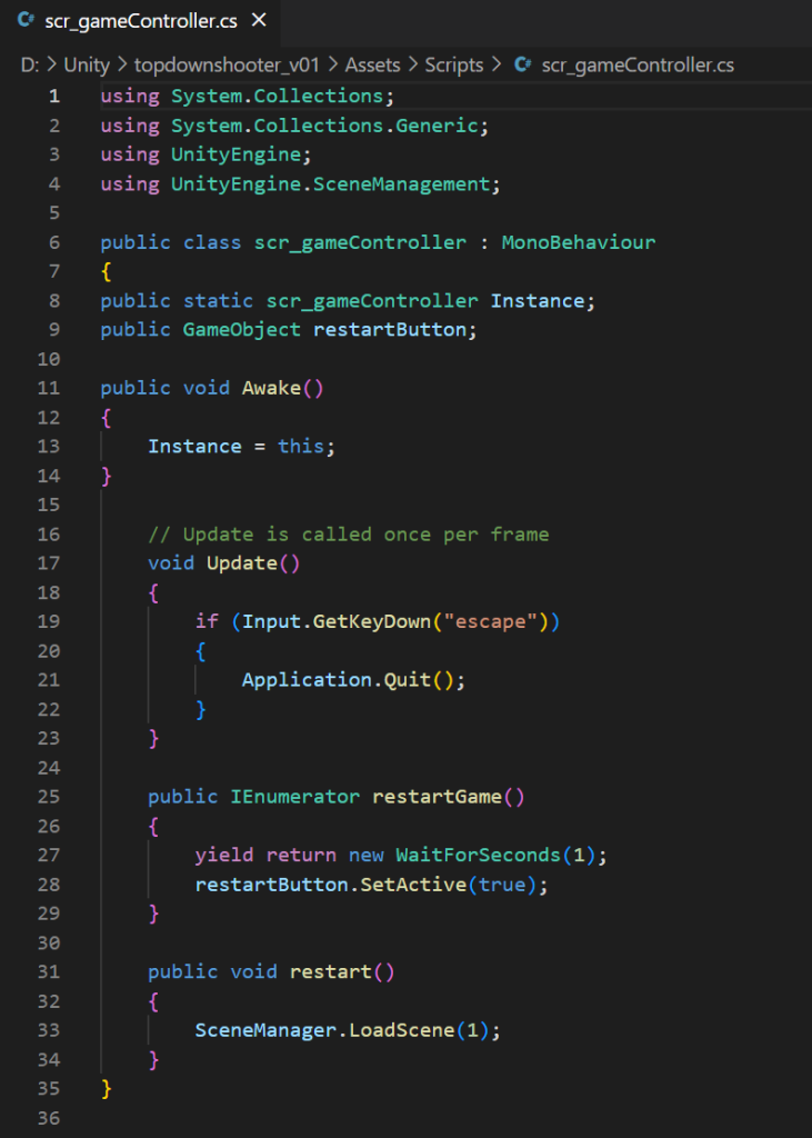 The second function is the restartGame iEnumerator function which activates the restartButton game object after one second the function is activated. This function is activated once the player is collided with an enemy and the function is referenced in the scr_enemyCollision script at the end of line 26.