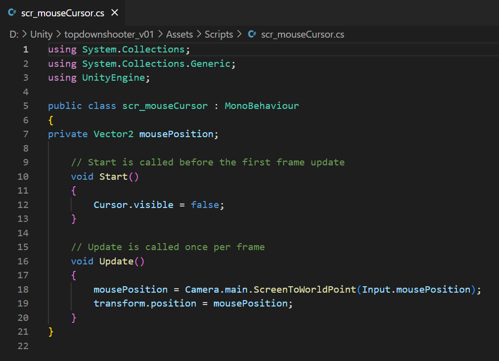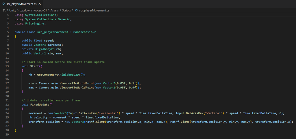 This script also sets borders within the game that prevent the player from moving off the map using the min and max variables made up of ViewportToWorldPoint vectors.
