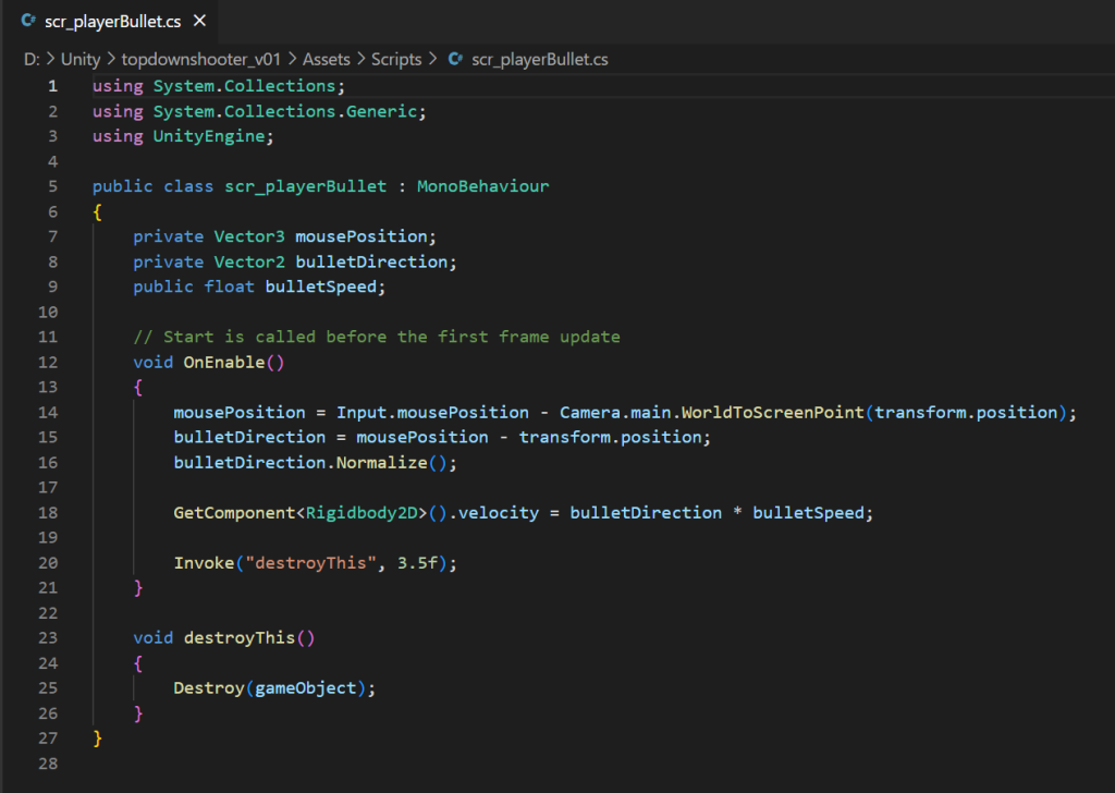 The first purpose of this script is to determine the speed of the bullet from when it has been spawned by the player. This is done through the inspector menu of the bullet prefab. This script also ensures that the bullet is moving in the correct direction from when it is generated and makes sure the bullet is destroyed after some time so prevent poor performance due to all the bullet clones. The bullet is destroyed via a 3.5 second timer from when it is generated since that’s enough time for the bullet to move off screen.