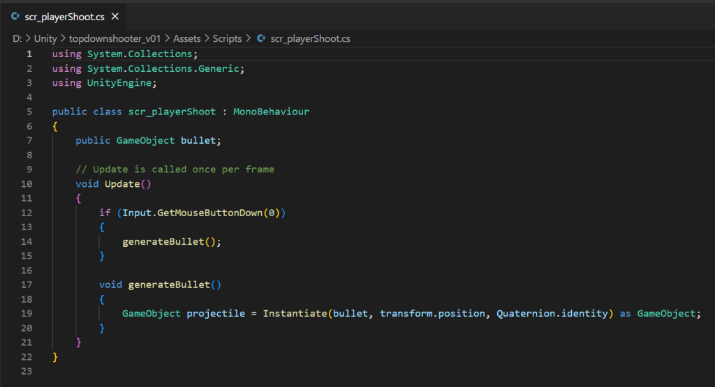 The other script, scr_playerShoot allows the player to spawn a bullet projectile from the Player game object’s bullet location whenever the mouse button is clicked. This projectile is then identified as a game object within the hierarchy. However this bullet isn’t able to move yet which is what the next script is for.