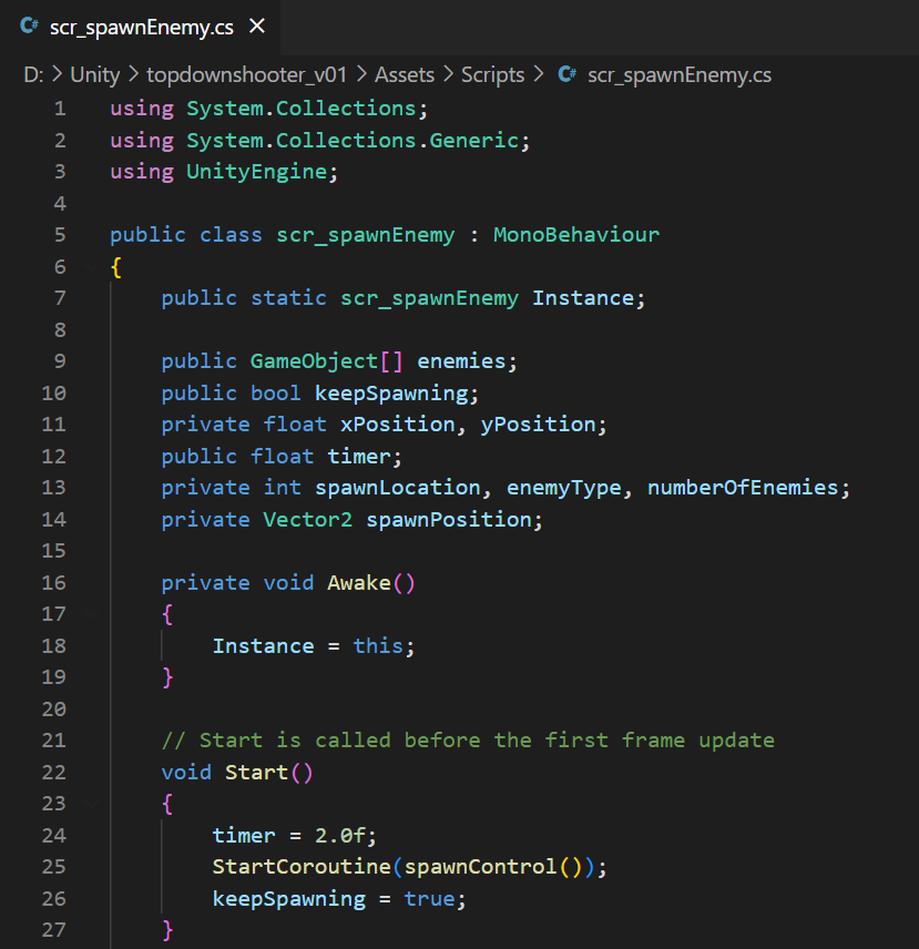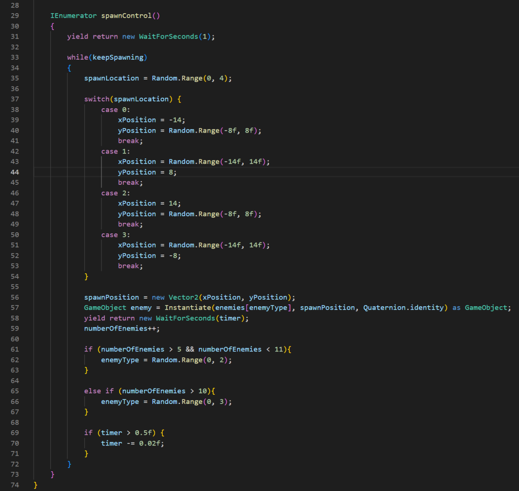 One of the first thing this script does is states all of the available locations where the enemies can spawn in the game, which is done with the switch function on the second image. The script then spawns one of the enemy prefabs which is determined by how many enemies there currently are in the game. If there’s more than ten enemies it introduces the fastest prefab enemy2 into the possibility of spawning.