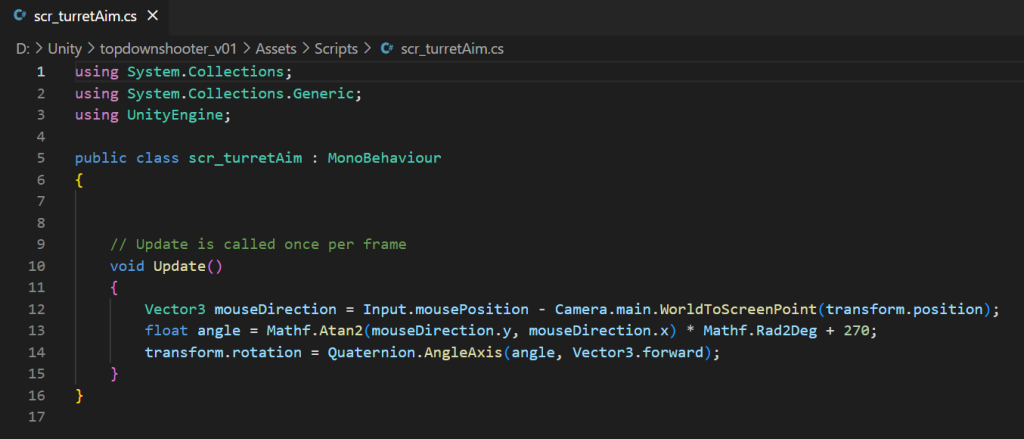 The script, scr_turretAim allows the player character to point in the direction of where it is going the shoot using rotation of the game object and the location of the player’s cursor, which it gathers in the update function before altering the rotation of the space ship.