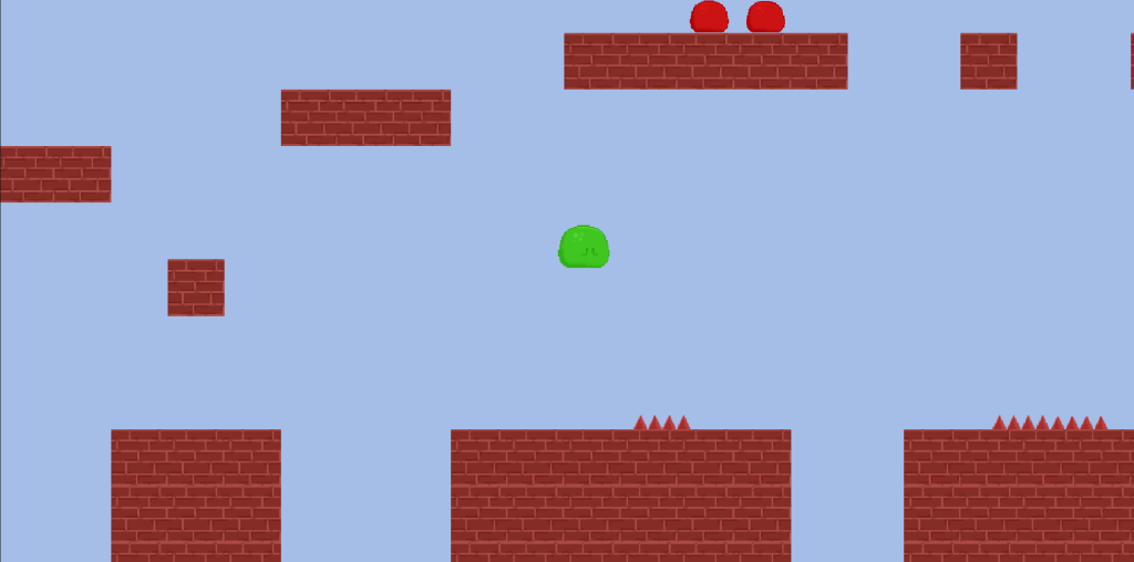 The decision for the red colour of the enemy slime and the spikes are linked to colour theory and symbolises the colour with danger. This tells the player visually that these game objects are dangerous to them and they should either be avoided or defeated (in the case of the red slime).