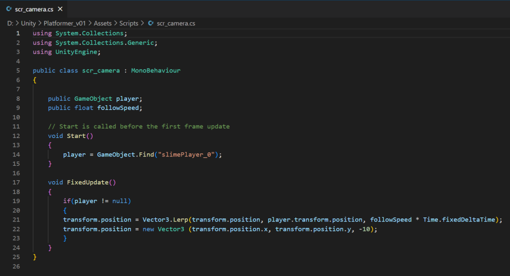 This script works by finding the player and taking the player’s position within the game, it then places the x and y coordinates in the transform component of the camera game object so that the main camera and player positions are identical. However, the z coordinate is fixed to -10, this is because if the player character’s z coordinate was the same as the player, none of the game objects will be visible since the camera is colliding with these objects.