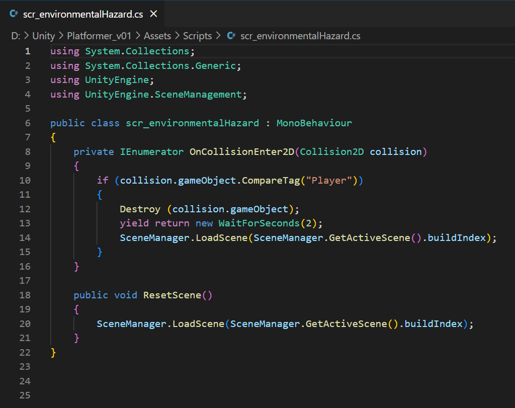 This script’s purpose is to destroy the player character and reload the scene when the player dies. It does this by detecting if a game object with the Player tag collides with any game object hosting this script. The script will then destroy the player game object and reload the scene after two seconds so that the reset isn’t instantaneous. The function, ResetScene is not required for this as no other script references this function therefore it is never used.