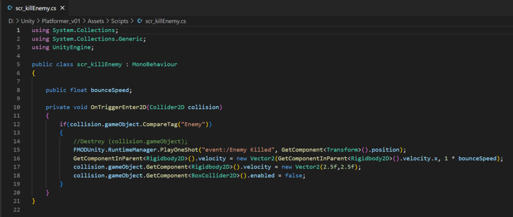 This is used by the game engine to do two things. The first is to make the player bounce whenever the ground check game object collides with the an enemy. The ground check width is smaller than the player character that it is connected to via the hierarchy, meaning that this bounce will only trigger when the player jumps on the enemy.