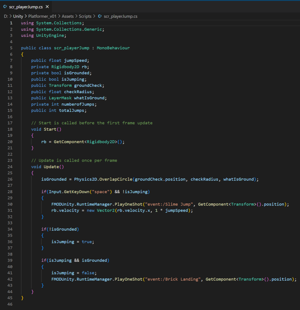 During this project was when I learned of and implemented PlayOneShot into the game script which gave me more control of when an audio would play in the game. The PlayOneShot audio files in this script display that the audio files, Slime Jump and Brick Landing will play when the isJumping bool is made true or false.