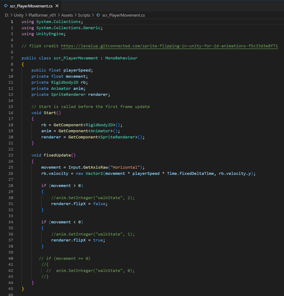 This script shown has two purposes, the first being to allow the player to move the slime character horizontally across the screen using the arrows and a,d keys on their keyboard. The player speed is set in the inspector menu in Unity which is set to 300, giving the player a balanced speed when playing the game so that the movement is comfortable.