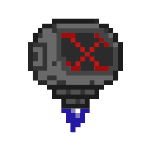 The enemy’s attack is a self-destruct sequence that will begin once it gets close to the player. The thruster in this animation also stops early and when this happens the sprite for the enemy would gravitate towards the ground to simulate this.