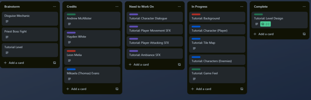 The first thing we did as a group after presenting our idea was to flesh it out more and set up a Trello page to keep track of everything that needs done, at this point we have set up tasks on the page which are required for the tutorial level of the game such as developing the game’s feel, tilemap, character animations, sounds, etc.