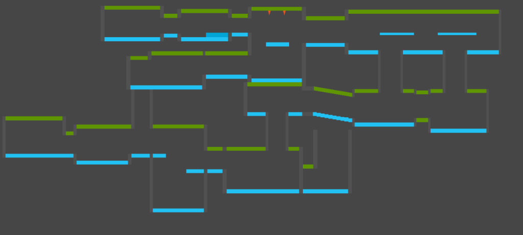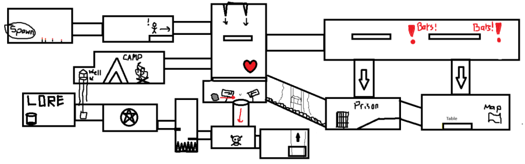 I made the level so that there is a split where the player can go in the third room from spawn. The idea is that the player will encounter a miner in the second room who will run away, and as the player moves the next room they can see the miner moving towards the room with the bats. This encourages the player to go to the area where the map is which will also let the player know there’s more rooms to the left which they would have only discovered if they fell off the platform in room three.