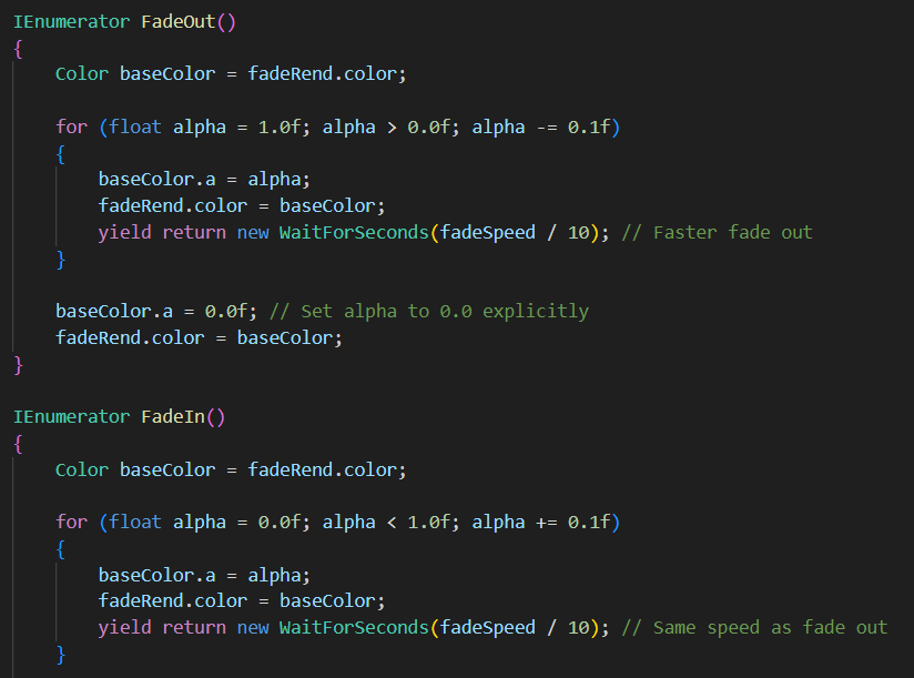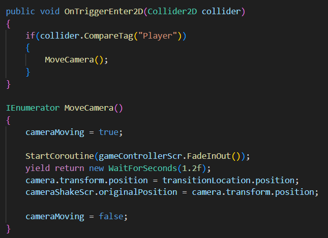 On the topic of cameras, my next step was to make a transition feature to move the camera when the player enters a new room, this involves fading the screen in and out and setting up all the different camera locations. At first, I tried doing this by having a black game object change opacity a little by little over a short amount of time, but it ended up a bit buggy, so I used ChatGPT to help me write a decent fade transition.