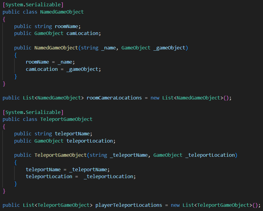 Then I made a script that will be attached to game objects at the entrances of the different rooms and have them transition to the correct room, I tried doing this by creating a public Vector 3 so I can control what coordinates the camera moves to on the script component in the inspector, but for some reason it didn’t work and kept coming up with errors, so instead I made empty game objects at the locations I want the camera to move and set it up so the camera will move to said game objects.