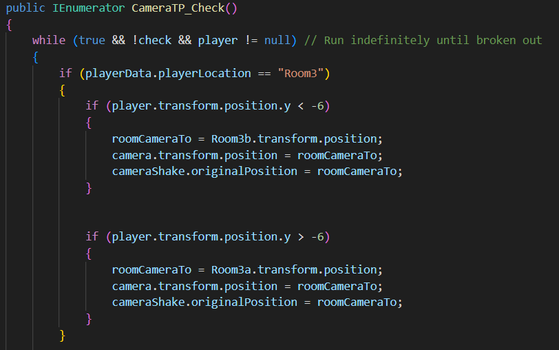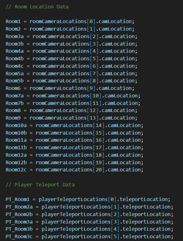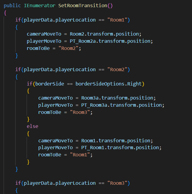 So, with this new script I needed to collect the data of where to move both the camera and player when they move to a different room which meant I had to track the which room the player was in at the time and use that to direct which rooms the borders will take the player.