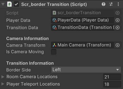 These borders where originally used to frame the camera but I figured out that I could attach the box colliders to them and transition when the player reached them, this meant I didn’t need as many game objects and it would prevent loops since the main issue last time was when transitioning the player, they would enter into a different box collider and it would move rooms again immediately, but with this it was easier to teleport the player outside any transition box colliders.