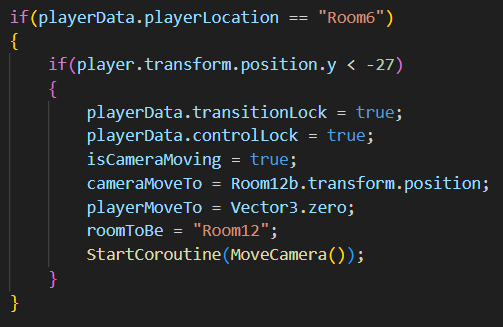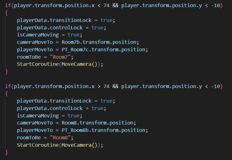 I had the order transitions set up, but what about the transitions that aren’t triggered by reaching the border gameObjects but instead are based on the player’s positions in certain rooms?