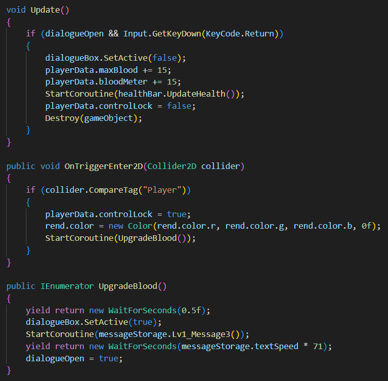 For the health restore script, I have it to just increase the health when it collides with the player, but with the upgrade max health script there’s a message connected to it so it can directly tell what the upgrade does since it may not completely clear even when a health bar is implemented.