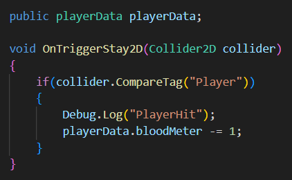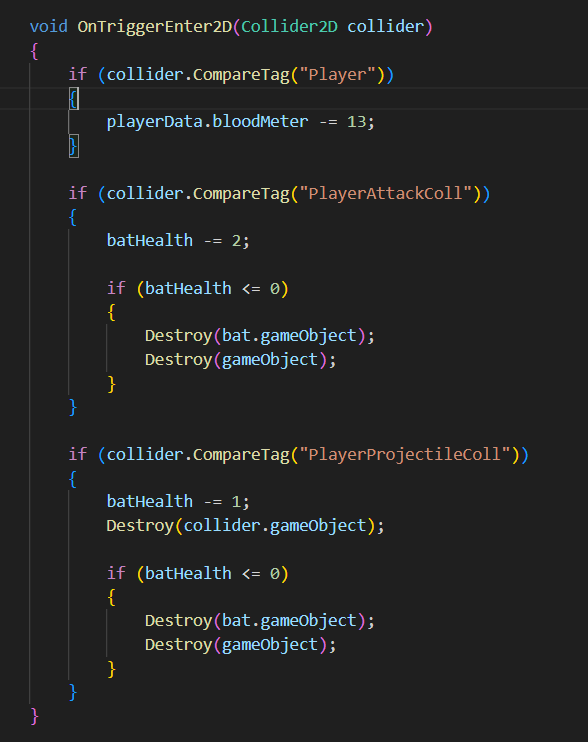 For the bats, I decided that their movement would work by having them bounce off the walls, ceiling and ground of the room they were in, and have them only moving when the player is in the same room; information that is provided by the playerData scriptable object.