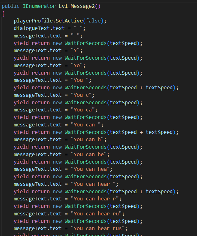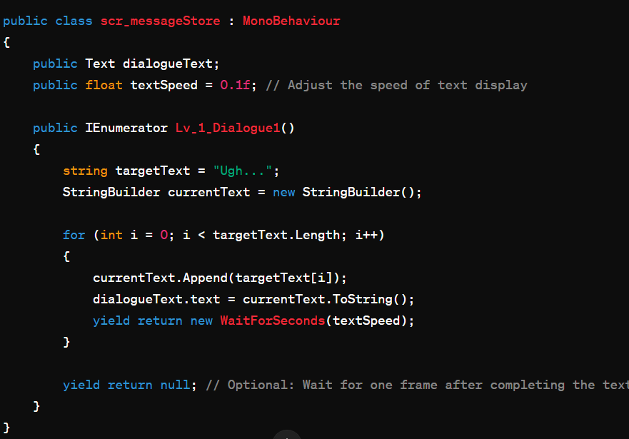 This IEnumerator calls for the dialogue script which is the scr_messageStore. Each time the dialogue is called the script waits textSpeed multiplied by each character in the dialogue text.