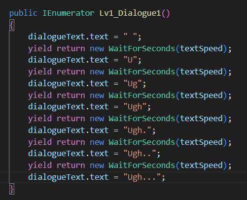 There is a WaitForSeconds code line in between each added letter with the variable textSpeed inside, this variable can be changed in the inspector so the textSpeed can be changed easily if needed and with the added bonus to use the variable in other scripts since it’s public.