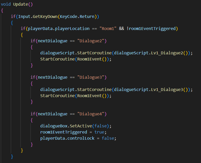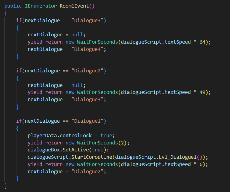 For the Room 1 event, the next dialogue is triggered when the enter key is is pressed by the player until the fourth press and the player is allowed to move by disabling the control lock.