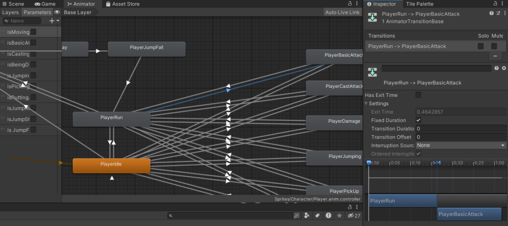 I pulled all of the frames into the animation window in Unity and made the animations, making sure to set the transition times all to 0 so the movement between animations were instant.