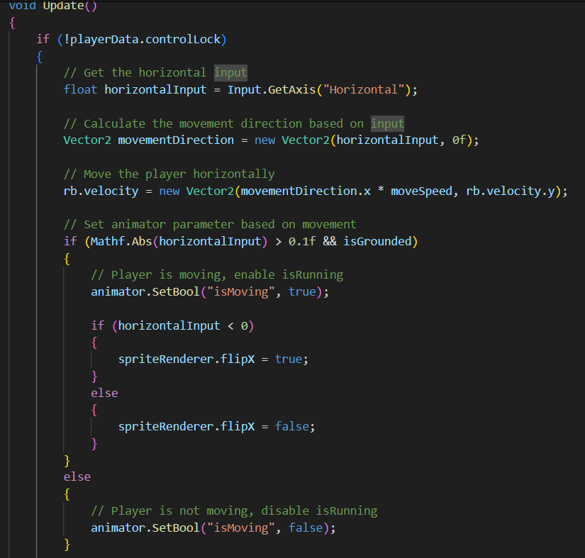 Later on into the level, I used ChatGPT to work up a simple character movement script for testing the transitions and to fix any bugs. This led me to create a transition and control lock to prevent any game breaking loops when the player moves room from room. However, it didn’t fix the issues completely.
