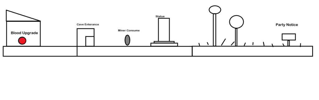 The first image includes the set for the previous cutscene which won’t be included in the level. Another aspect of the level is that there’s a blood upgrade on the left of the character which rewards the player if they break the general idea a side scrolling level’s beginning you can’t move left.
