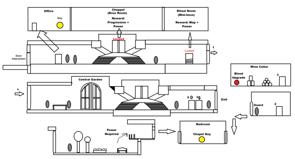 When making the level I thought of different ways the player can approach it, for example, the player can reach the bedroom either by the room inside which has a guard or by using a power in the central garden.