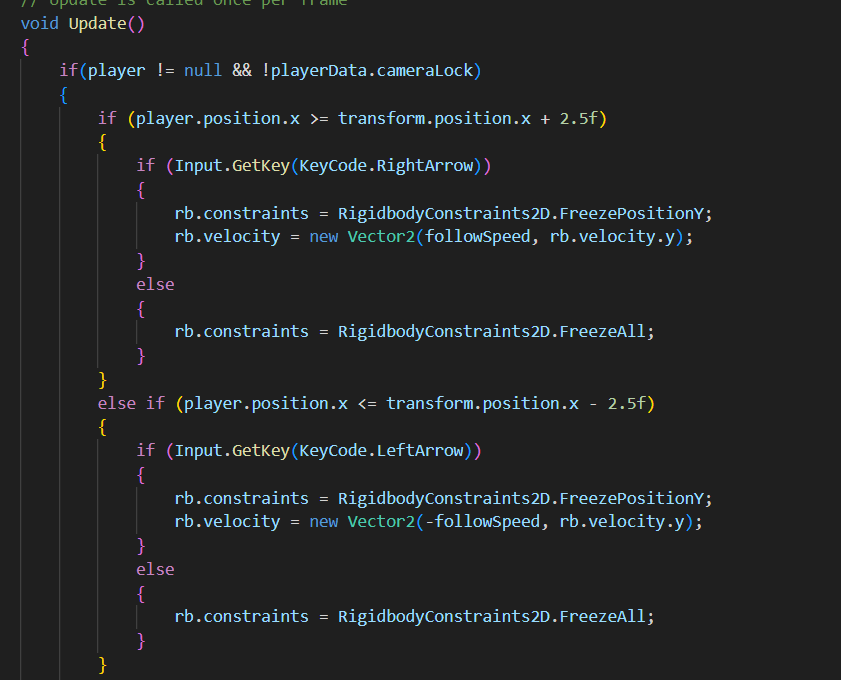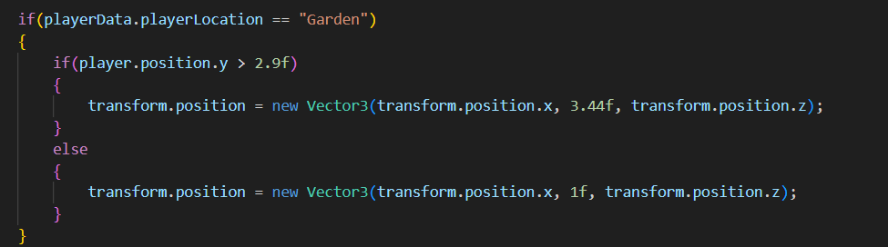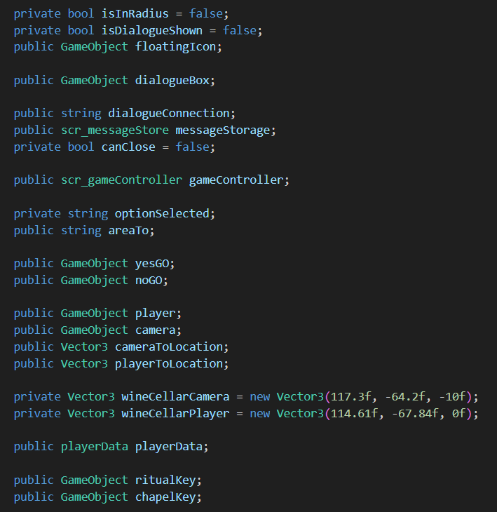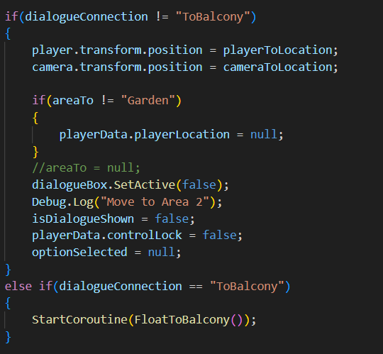 And another was the garden camera not changing when the player falls from the balcony after using the float power which I fixed by stopping a playerData.playerLocation = null; code line from running if the dialogue connection was ToBalcony. (This bug shows up in the playthrough video but was fixed after the video was recorded and is now fixed in the submitted game)