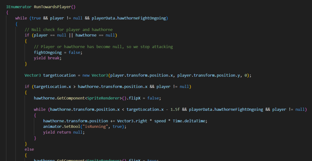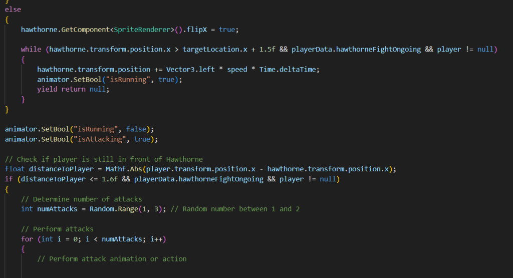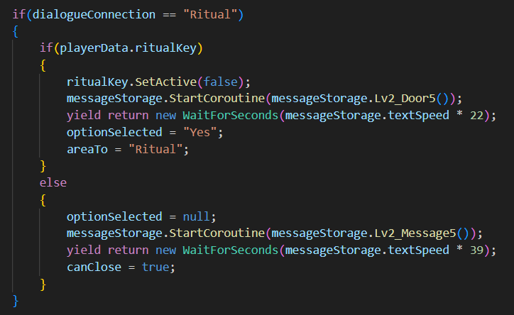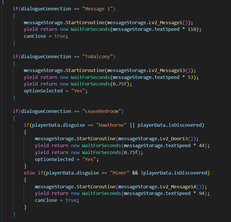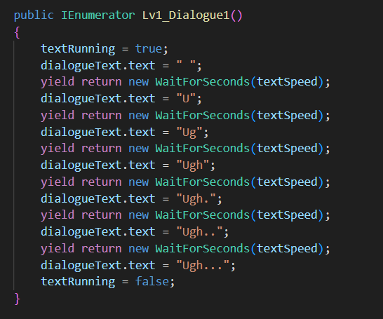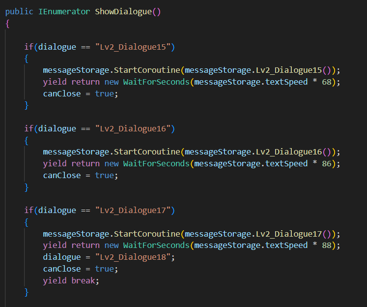 Two of the NPCs in the game switches their dialogues the second time the player interacts with them, this was done by changing the dialogue variable to the next one when the first is called in the coroutine such as with the if statement above, if(dialogue == “Lv2_Dialogue17”.