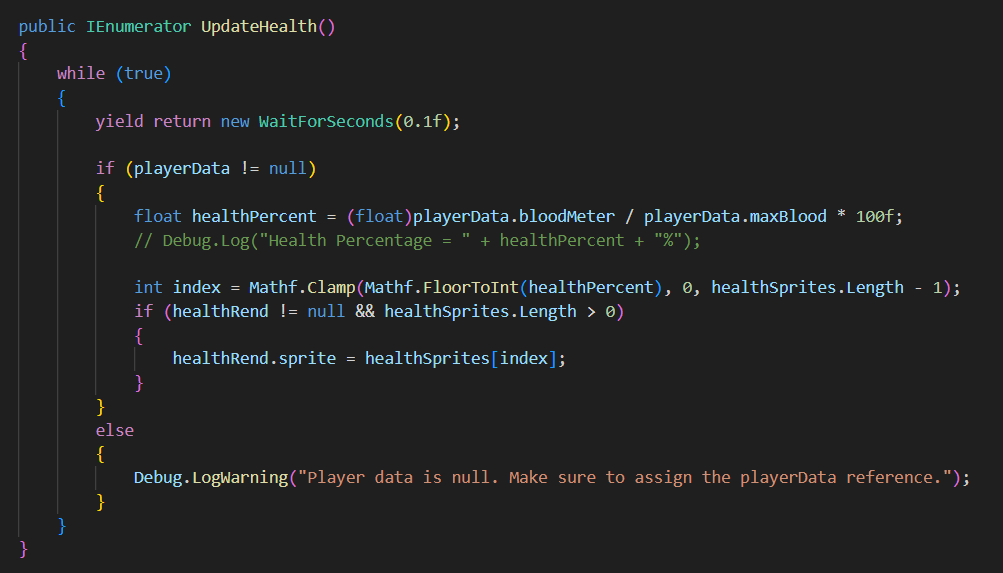 I used ChatGPT to help me with this part after trying on it by myself for a while by giving the AI what I had which was a public list of each of the frames which I added in the inspector and trying to generate a percentage of the health, changing it to an int and using that to change which sprite was shown.