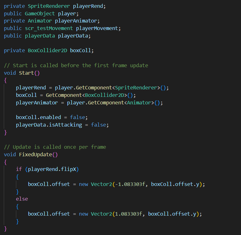 The melee attack script is in charge of managing the player’s melee attack animation, changing the box collider’s offset based on where the player is facing.