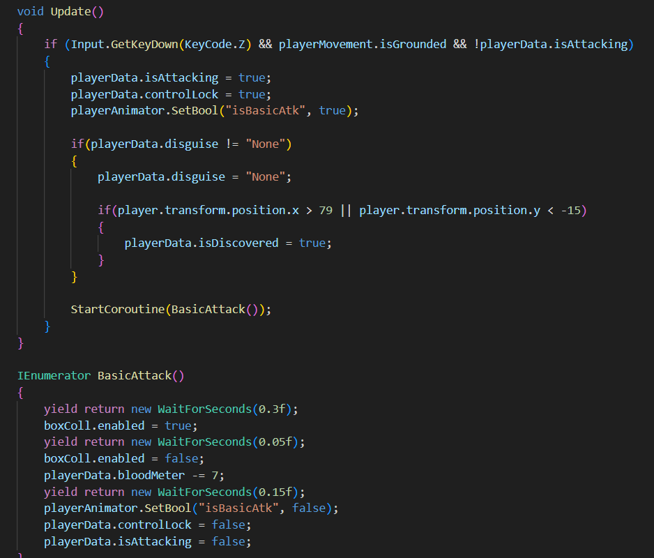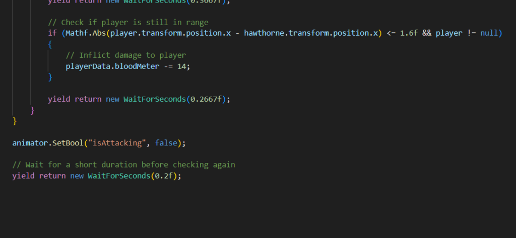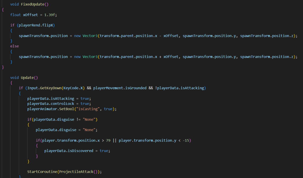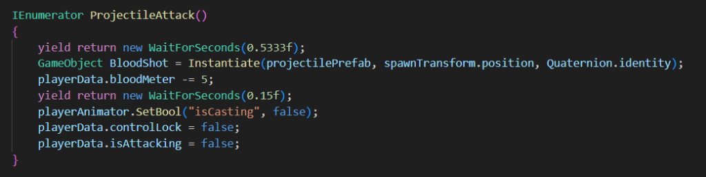 The last two images are for the Projectile Spawn script which like the melee attack sets on where the projectiles spawn based on where the player is looking, decreasing the blood meter and managing the player’s casting animation.