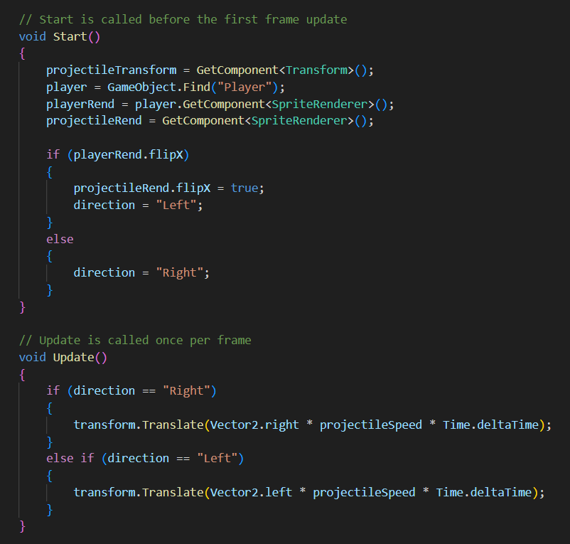 This is the script that attached to the player’s projectiles which determines which direction they will move they they are instantiated.
