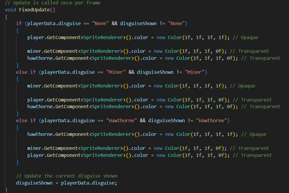 The Miner and Hawthorne disguises are attached to the player game object and still run their animations, only they’re transparent unless they’re selected.