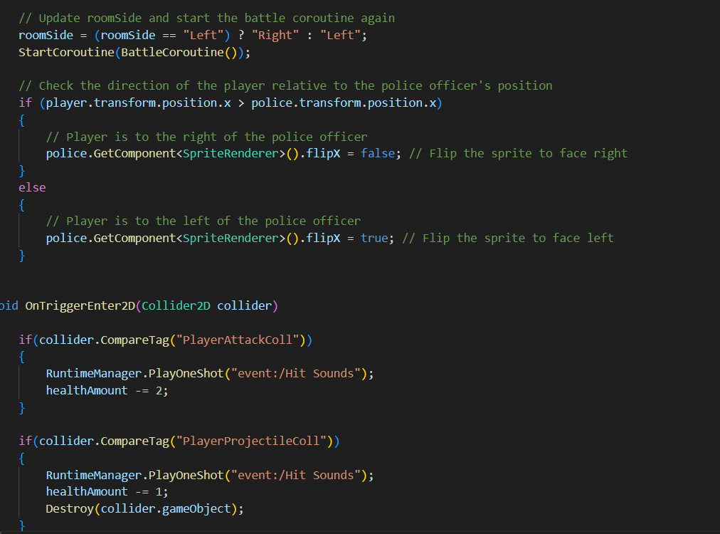 You may notice that there isn’t any damage enemy code, that’s because the enemy damage is all managed on the enemy’s scripts and will deal damage when the enemies enter into an object with the playerAtackColl tag or playerProjectileColl tag.