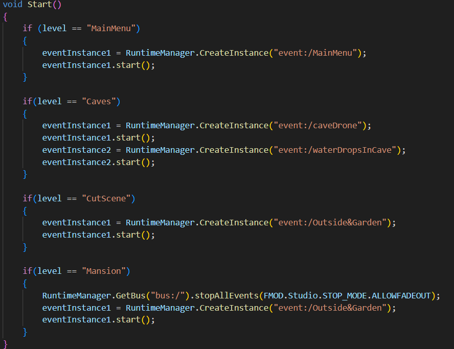 For the Main Menu and some of the music I used a script called scr_audioController which starts certain music depending on the scene and stops music when the script is destroyed after transitioning to a new scene.