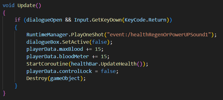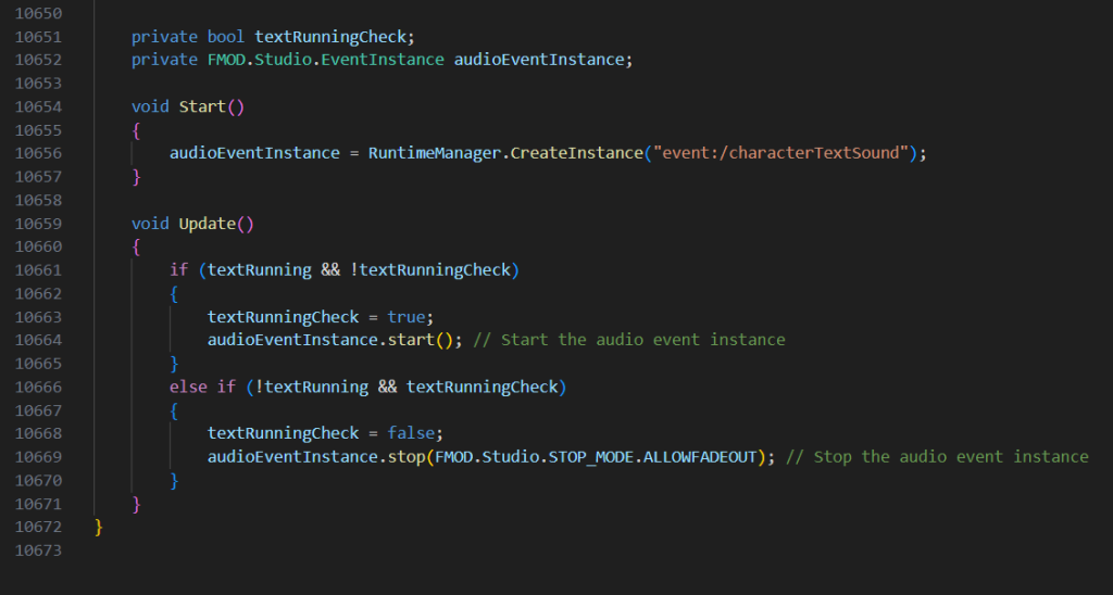 In the message store, I added it so that if the textRunning bool is enabled the characterText sound effect will play which has a loop on FMod. For this to work, I had to add the textRunning bool to the starts and end of each of the dialogues and messages.
