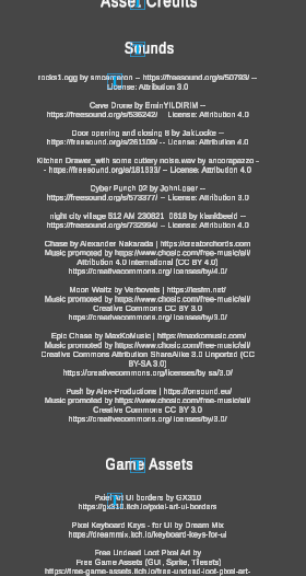 After adding all the sounds, I updated the Credits to include all of the credit required sounds used in the game as well as any game assets and fonts that needed credited.