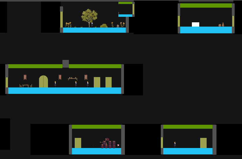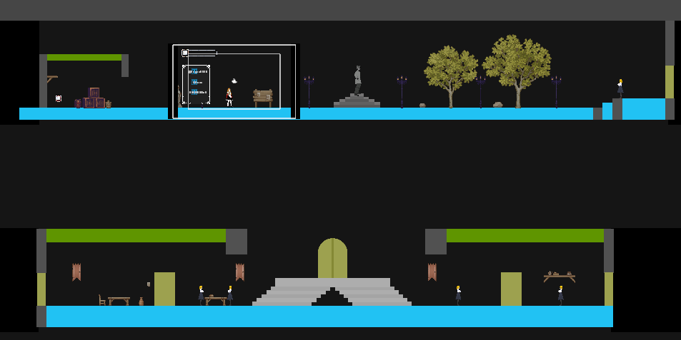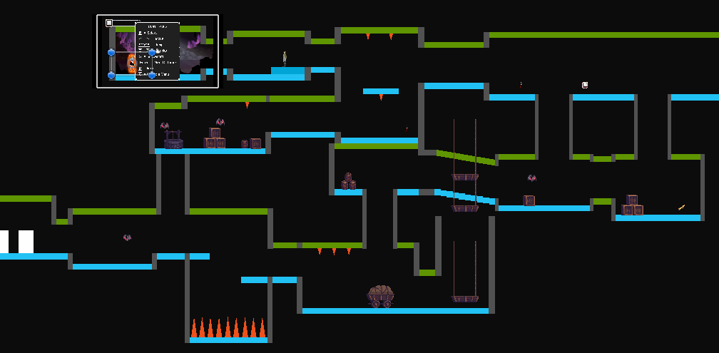 For the camera, I decided to shift from the cave level’s room by room camera transitions to a following camera that moves when the player starts moving while they’re a certain x distance away from the camera centre, this is because a lot of the areas are too large to use border transitions without interrupting the flow of the game.
